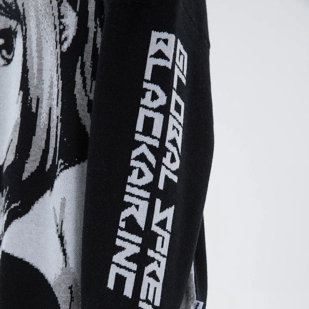 Secure the japanese Harajuku Anime look with unique knitted piece. Our Anime Girl Harajuku Knitted Sweater features a black and white design depicting a Anime girl inspired from japanese videography and culture. This is a must have streetwear piece.Â