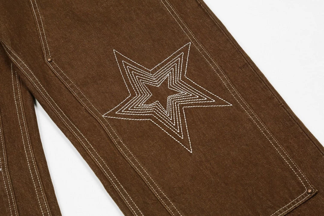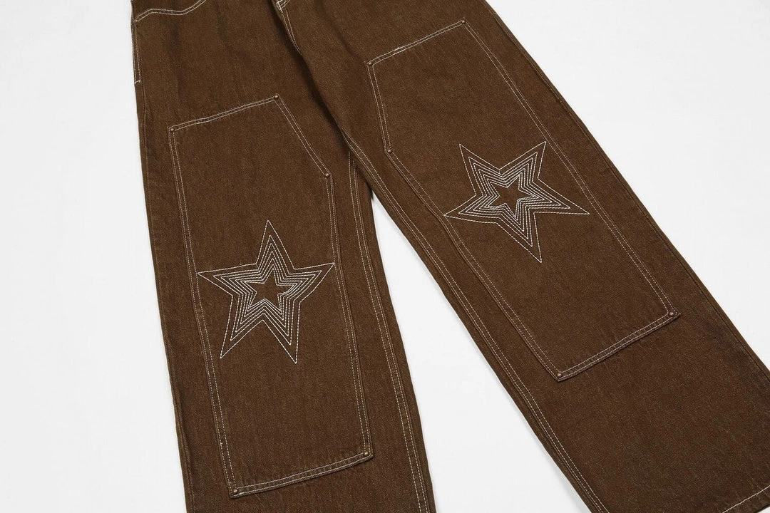 Our Brown Star Loose Denim Jeans have a very current streetwear look thanks to its wide straight leg construction. The jeans feature a embroidered stars on the front reminiscent of a wild west style. The back design features more bold embroidery helping these jeans to stand out.Â