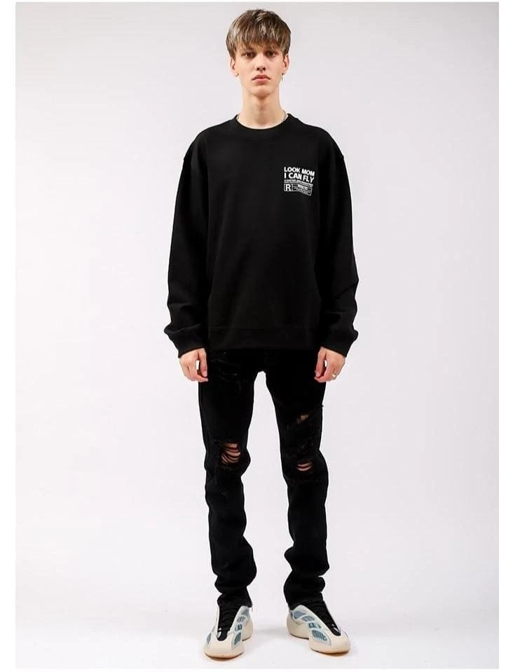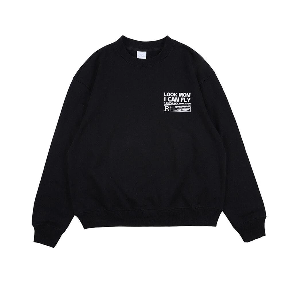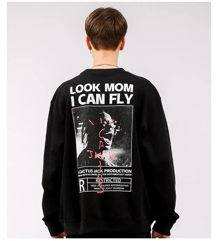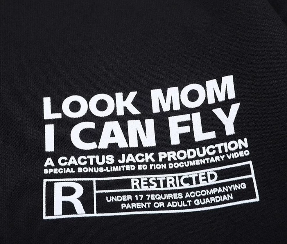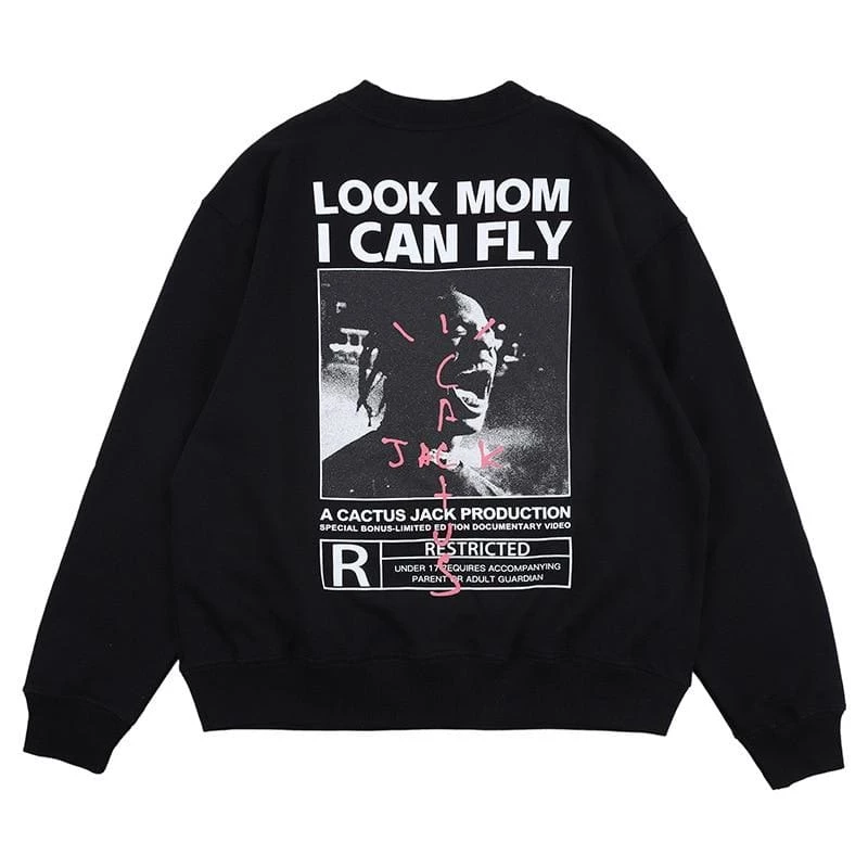 A cactus jack production presents you the Look Mom I Can Fly Sweatshirt! This thick premium sweater features a depiction of Travis Scott on the back in a documentary film poster style with font saying ‘Look Mom I Can Fly’ on front and back. Secure the look.Â