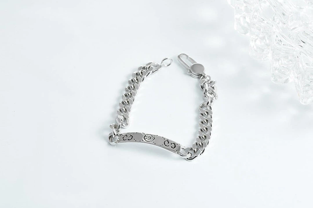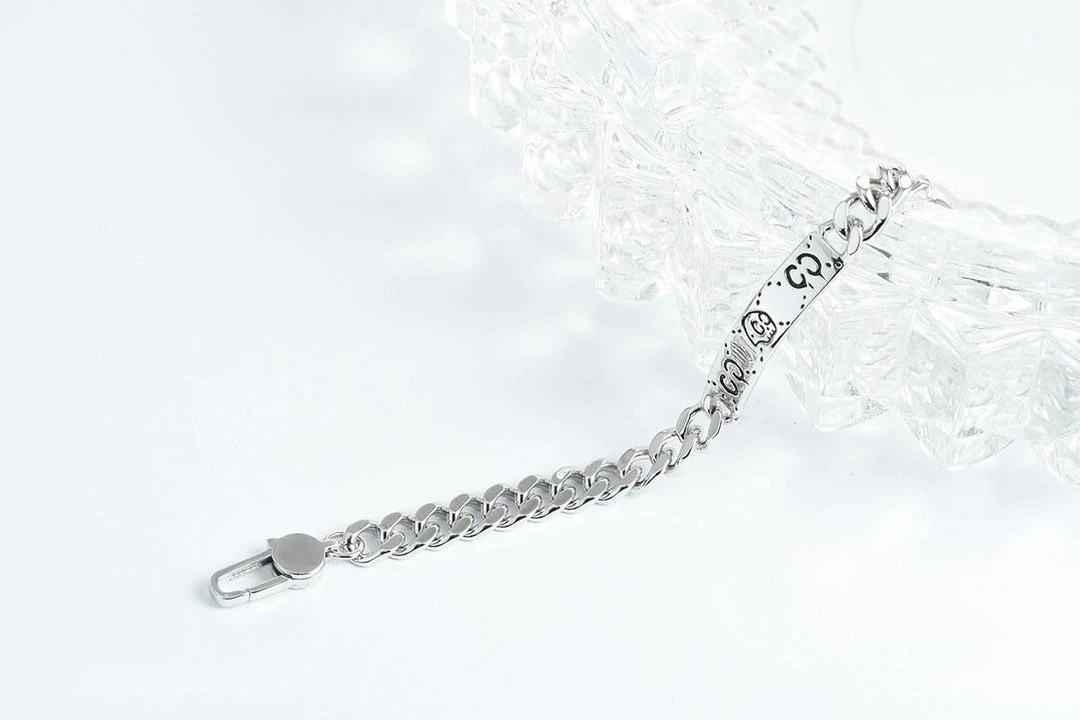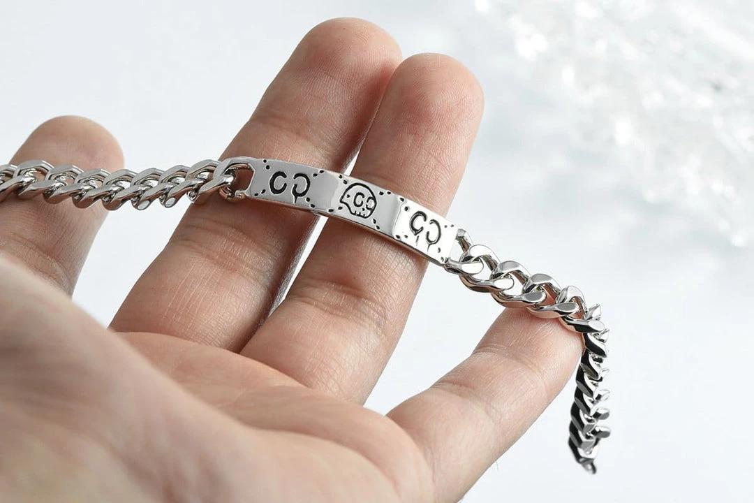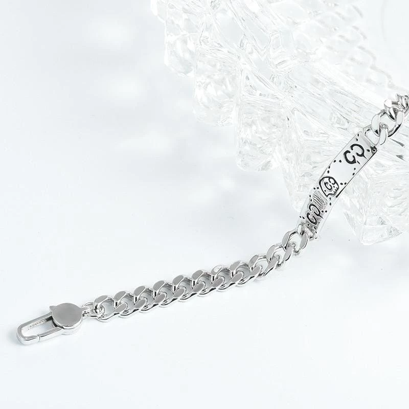 Give your wrist that designer look with the GG Ghost Bracelet! This stainless steel piece features a chain link construction with a steel bar. The design itself consists of ghost like skull and GG monogram engraving. This is a must have premium piece available in a range of wrist sizes.