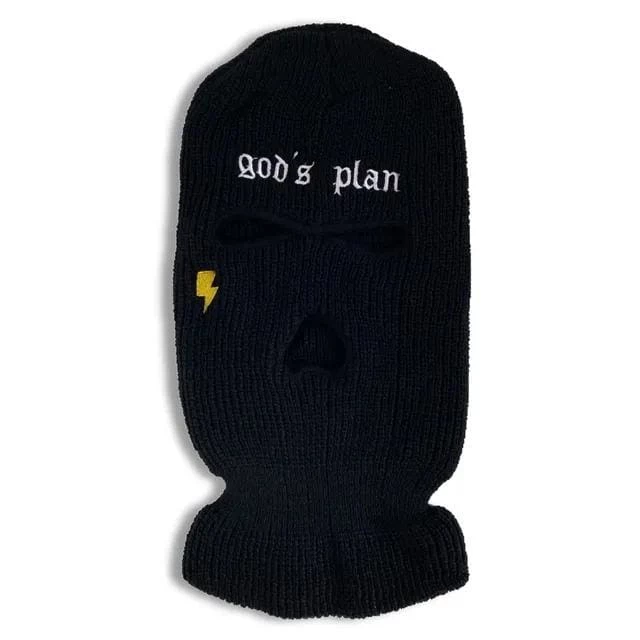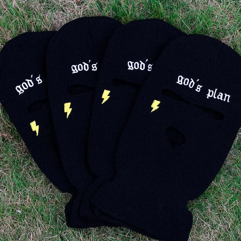 Give yourself the ultimate unique look with the Gods Plan Fashion Ski Mask! This balaclava comes in black and feature custom embroidery saying “Gods Plan” referencing one of Drake’s biggest hits! They also feature lightning under the eye. This a must have one of a kind streetwear piece.Â