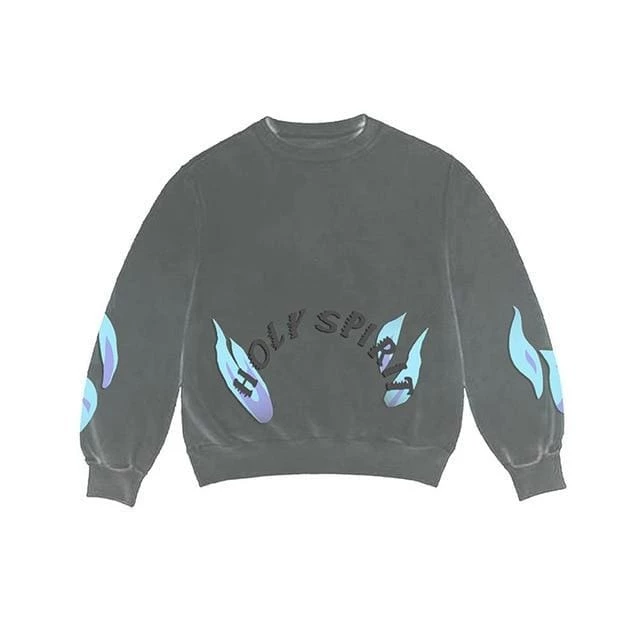 Join Kanye West’s Sunday Service and feel the holy spirit in Streetgarm’s Kanye West Holy Spirit Sweatshirt in Grey. The blue flame style detailing your outfit will look fire. An oversized slouchy fit easy to throw on over any look.