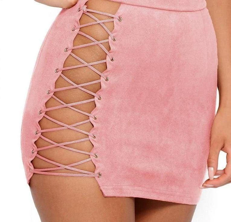 Dare to add a little lace with our dreamy faux suede two piece. Featuring a halter-neck crop top and figure hugging lace up mini skirt, available in muted khaki and pink – perfect for those A/W nights out.