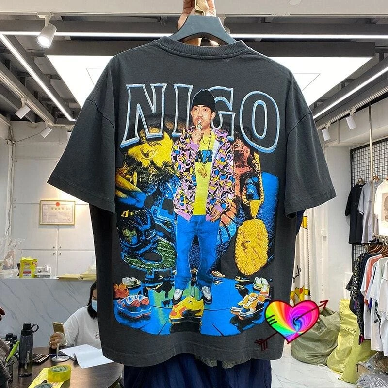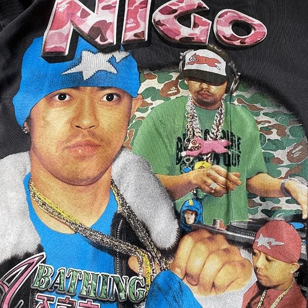 Pay homage to Nigo the mind behind the iconic streetwear brand A Bathing Ape. This tee inspired by the work of Marino Morwood features a variety of pictures and font representing Nigo giving off a retro 90s look.Â