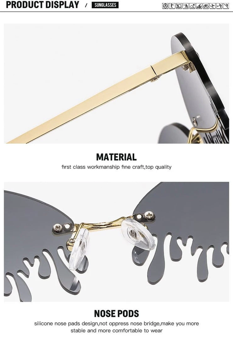 Get the 90s frameless tinted look with a twist. Our Oval Rimless Drip Sunglasses feature a unique dripping design that is guaranteed to make sure your fit stands out. Made from high quality materials they offer UV protection.Â