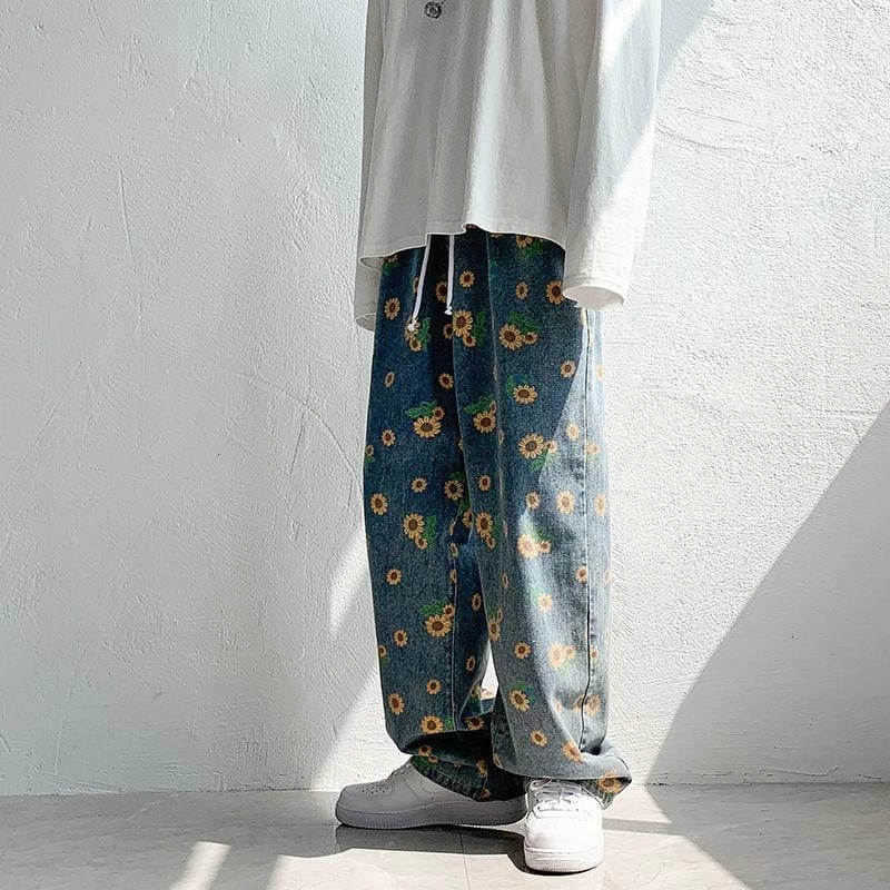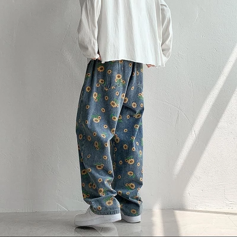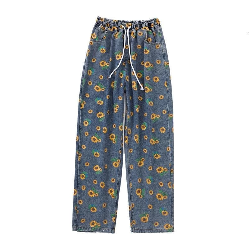 Time to secure a unique look with these Sunflower Graphic Printed Jeans! Made from baggy denim to give a loose wide leg look the design features sunflowers all over the jeans. These give off a fresh summer streetwear vibe.Â