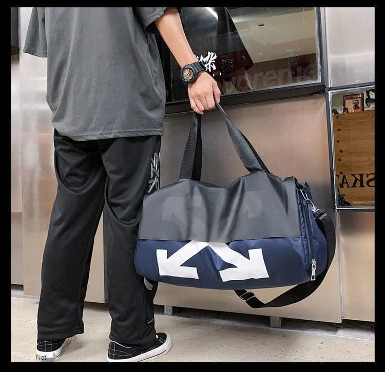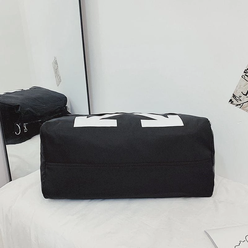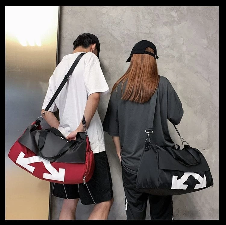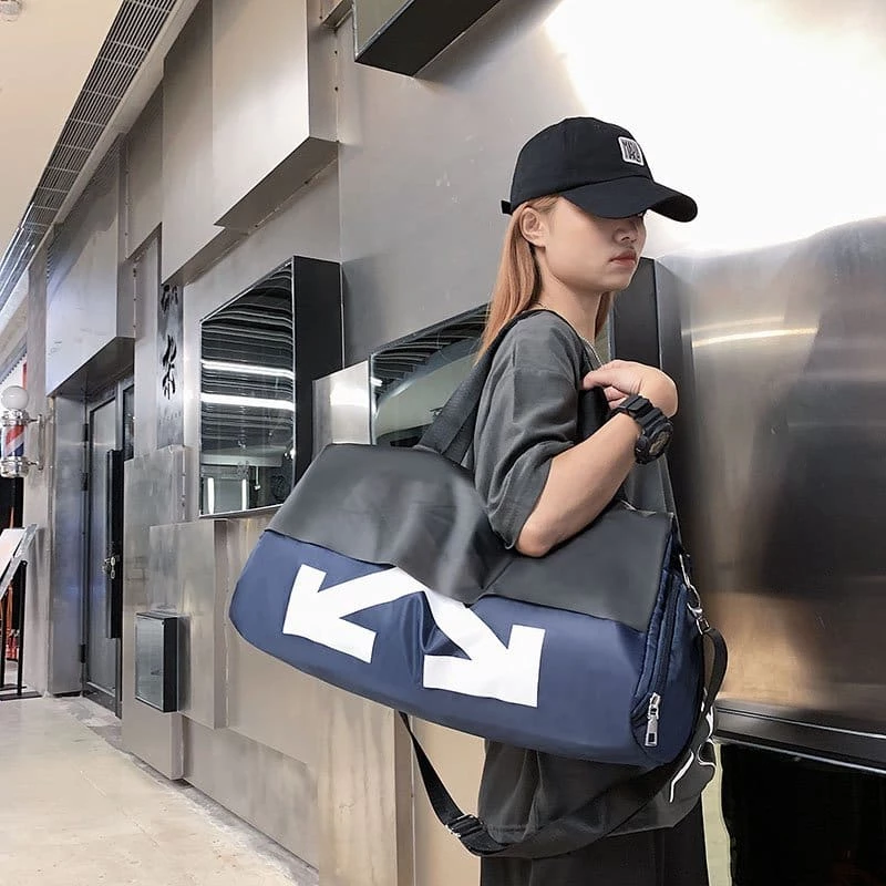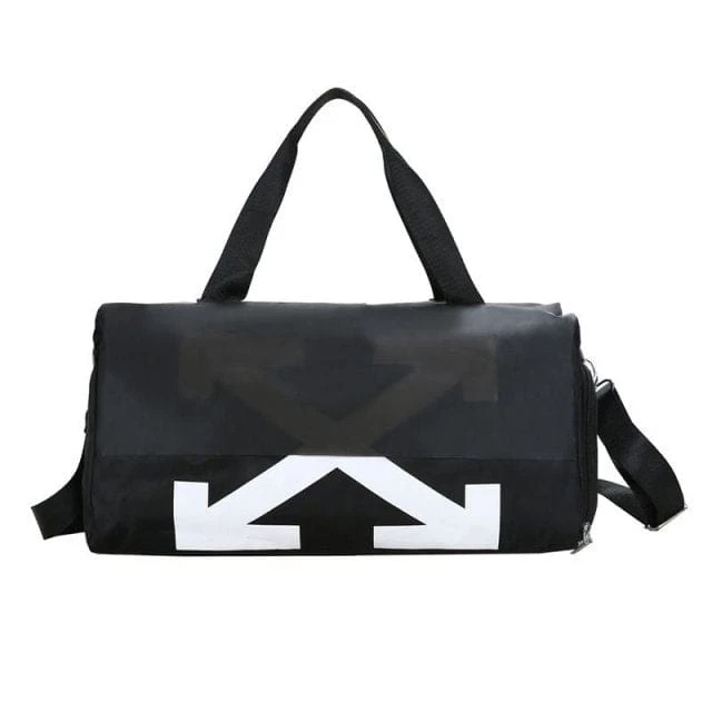 Our versatile travel and leisure Virgil Duffle Bag comes in a choice of three different color options all featuring bold white arrows the iconic fashion designer Virgil Abloh is famous for. The bag is made of fabric with a protective coating making it waterproof and is great for everyday use. 46cm x 16cm x 22cm making it practical for vacation or the gym.Â