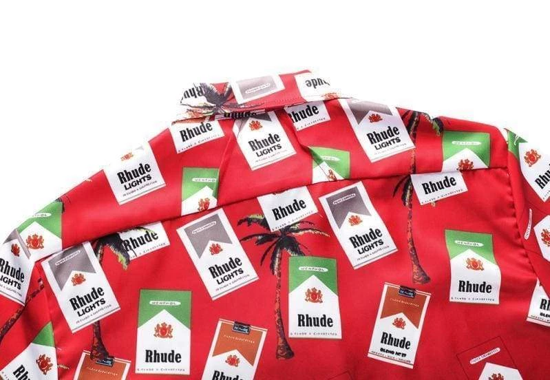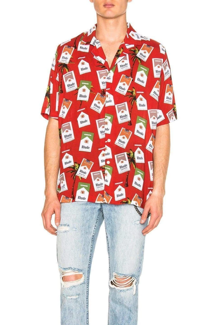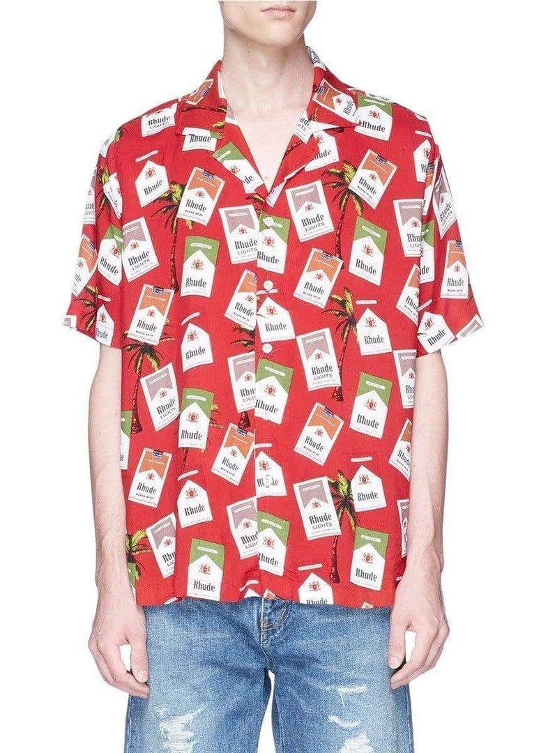 Composed in the U.S. of red plain-weave, Streetgarm’s Rhude Hawaiian Cigarette Shirt showcases multicolored palm tree and logo-branded cigarette box graphics. This vintage-inspired style is completed with a notched collar and short sleeves.