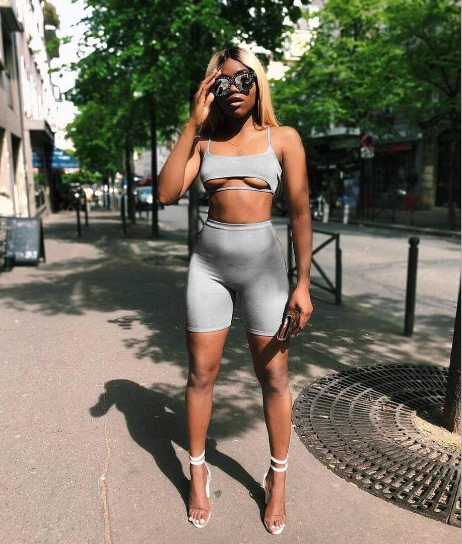 Liven up your off-duty wardrobe and dare to bare with our cycle shorts and crop set. Available in grey and black, featuring an underbust top, shape-enhancing fit and high rise waist.Â