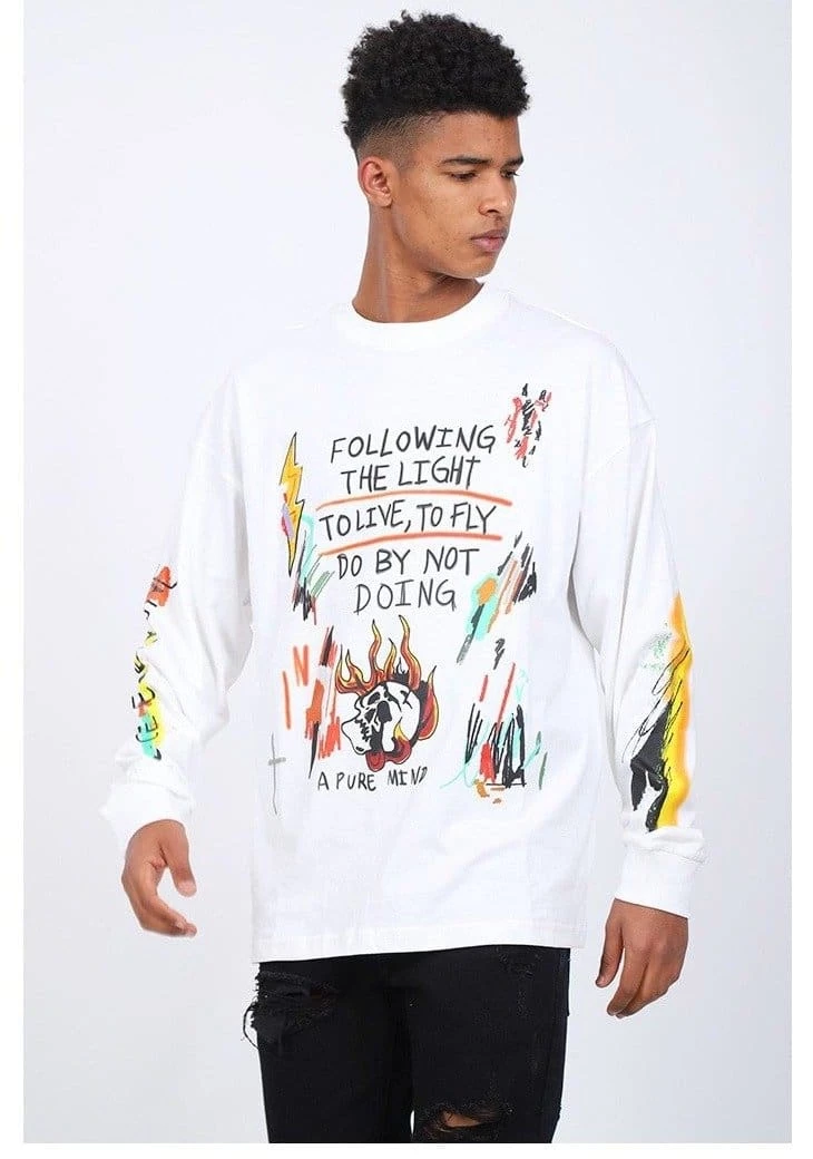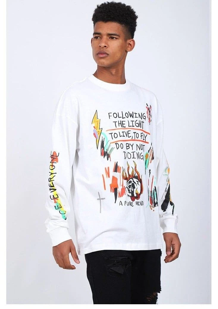 Get the Kanye West look by ‘following the light’ in Yeezy Wes Lang Wyoming Long-Sleeve T-Shirt. Now available in White. The tee features unique designs and phrases like ‘do by not doing’, Famously worn at the Ye listening party in Wyoming.Â